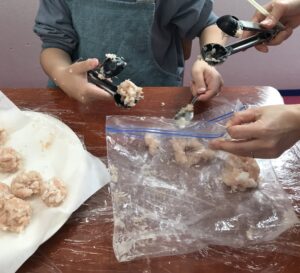 すいとんを茹でる間に鍋の準備です。野菜班とつくね班に分かれ、野菜班は包丁やピーラーで人参や大根を薄くスライスし可愛い形に型抜き。つくね班はひき肉とはんぺんをコネコネしてどんどんつくねを作ります。煮込んでいる間にスイーツ用のみたらし餡も作りました。