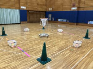 玉入れでは写真の様なカゴを目掛け、カラフルなボールを時間いっぱい投げ入れていました。